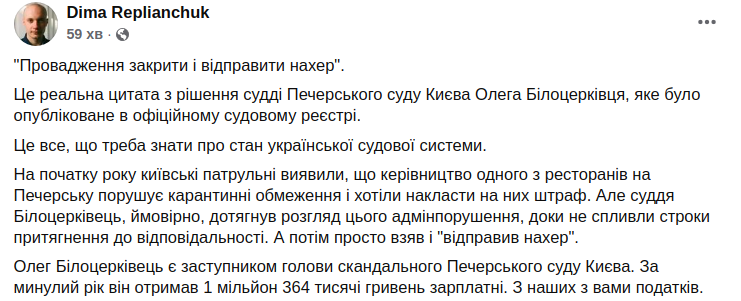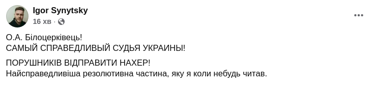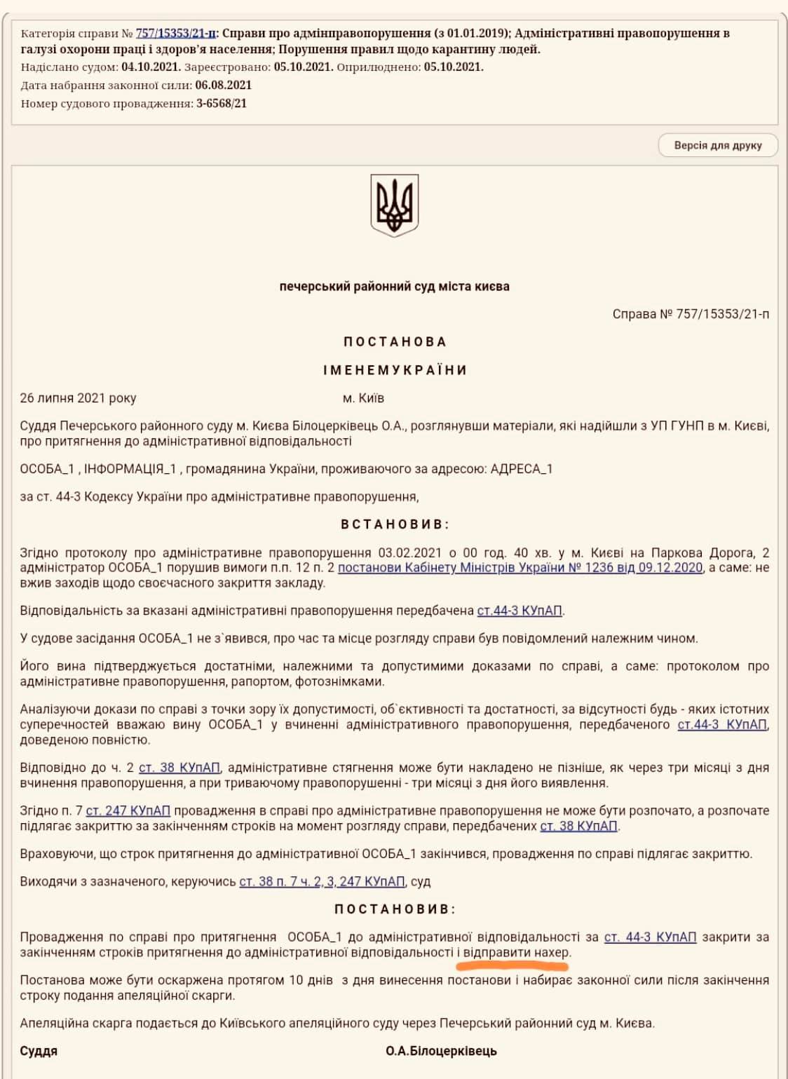 В том же постановлении было указано "Отправить на**р". Под данным постановлением стоит подпись судьи Олега Белоцерковца.