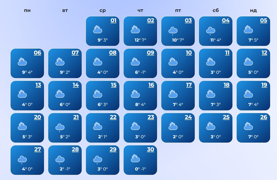 Максимальная температура воздуха в ноябре достигнет 12 градусов, а к концу месяца снизится до -1°С. На протяжении всех тридцати дней последнего месяца осени солнце над столицей не покажется.