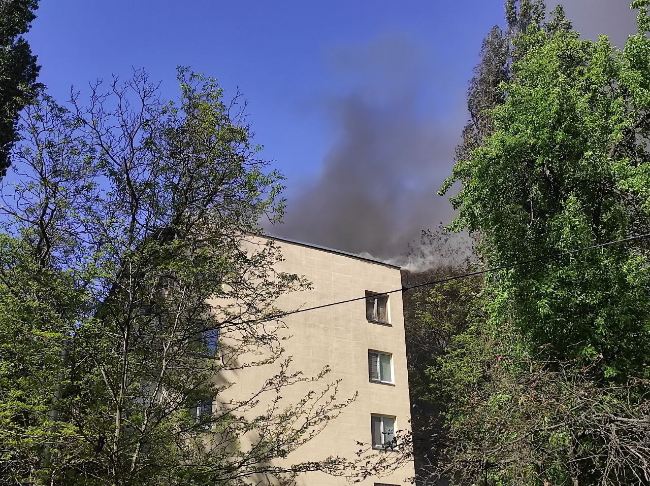 Отмечается, что в пятиэтажке на улице Выговского, 8г, загорелась квартира на пятом этаже. Огонь распространился на крышу дома.