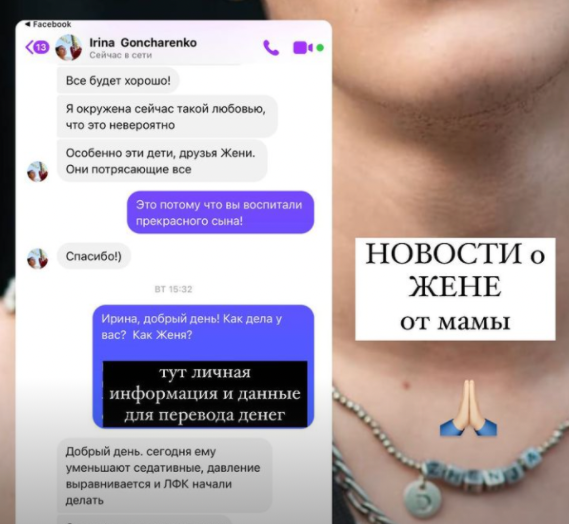 Как заявила девушка, Евгений Гончаренко может пробыть в коме еще несколько месяцев. Его левая часть тела обездвижена, нарушена опорно-двигательная система. Подруга Дорофеевой опубликовала переписку с мамой Гончаренка, в которой рассказано о состоянии Евгения.