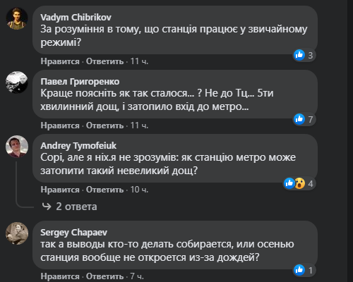 Киевлянка Марина пишет в соцсетях, что из-за почти тропического ливня, который продолжался минут 20-30, два выхода и один вход на станцию были залиты водой. В то же время один вход остался сухим, а людей из прибывших поездов просили выходить с платформы через вход. Всего ограничения продолжались около двух часов.
