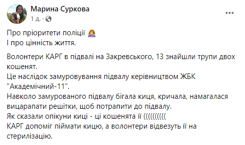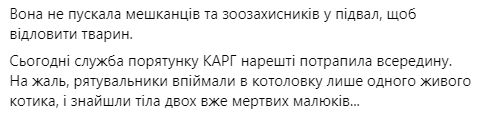 Впоследствии волонтеры Kyiv Animal Rescue Group обнаружили в подвале трупы двух котят и одного живого.