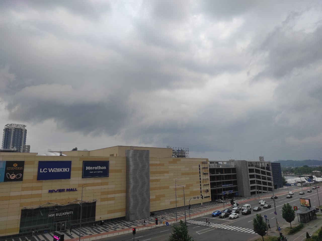 Соответствующие кадры сделаны на Днепровской набережной возле ТРЦ "River Mall", облака больше всего скопились над водной гладью Днепра, которая, как известно, еще больше притягивает дожди.