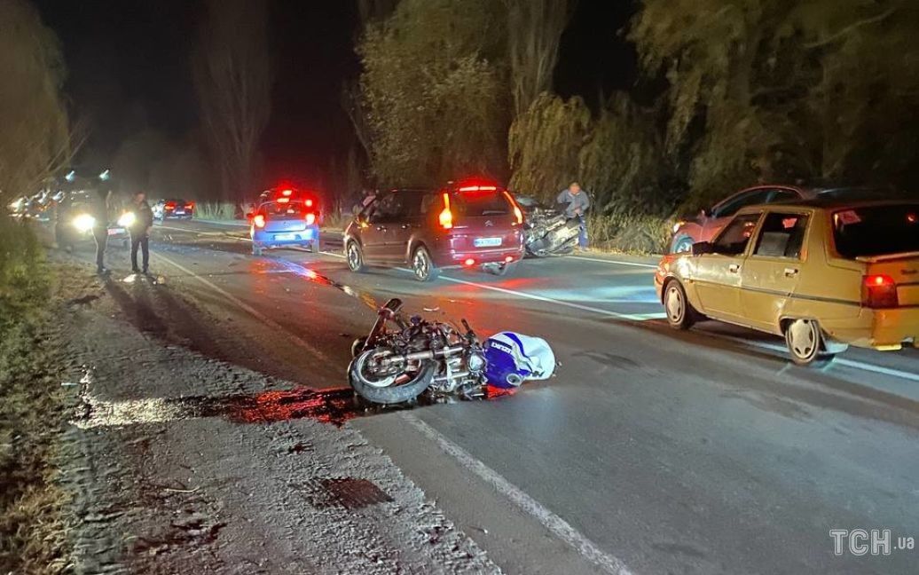 Водитель автомобиля Skoda, в салоне которого находился ребенок, решил пойти на обгон и на встречной полосе врезался в мотоцикл. В результате аварии у мотоциклиста от удара раскололся шлем и он отлетел приблизительно на 50 метров. Сообщается, что после падения он остался лежать без движения. Позже его в критическом состоянии забрала машина "скорой помощи".