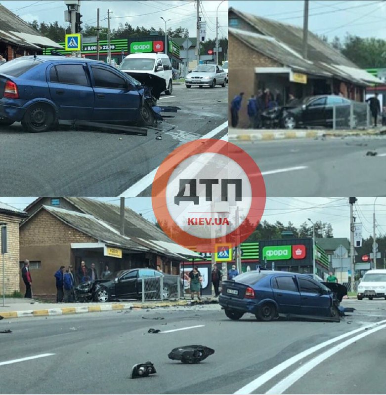 В Киевской области на "Новоирпенской" трассе произошло опасное лобовое ДТП. Одну из машин откинуло на тротуар в ходе столкновения.