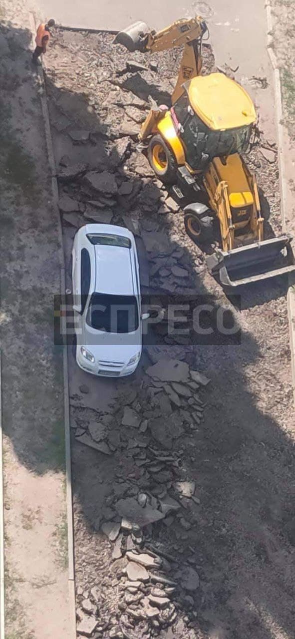 Курьезный инцидент произошел на Троещине. Припаркованный Chevrolet Aveo остался на островке асфальта, а вокруг спецтехника полностью сняла дорожное покрытие. Таким образом, машину окружил песок с асфальтовыми острыми глыбами.