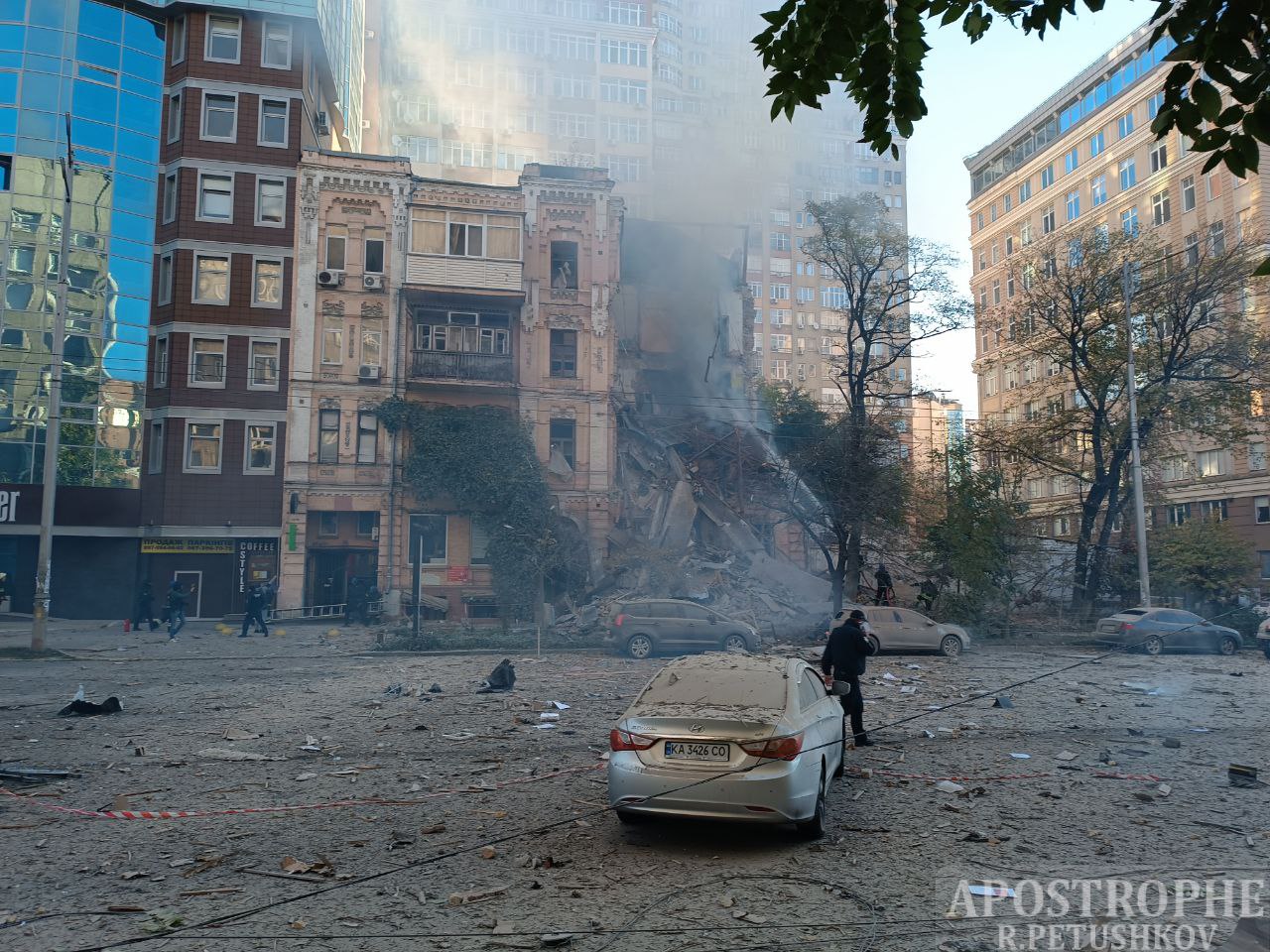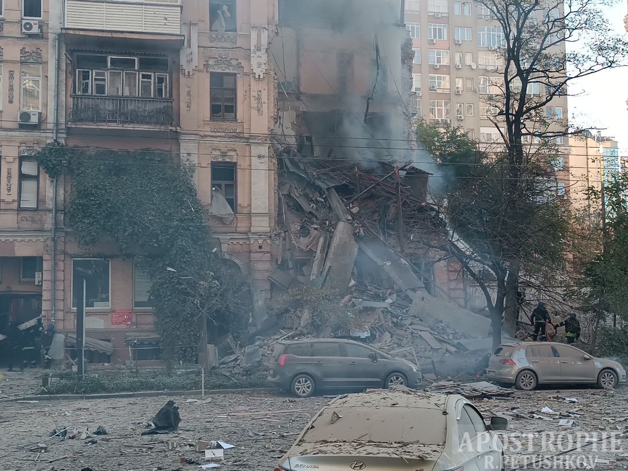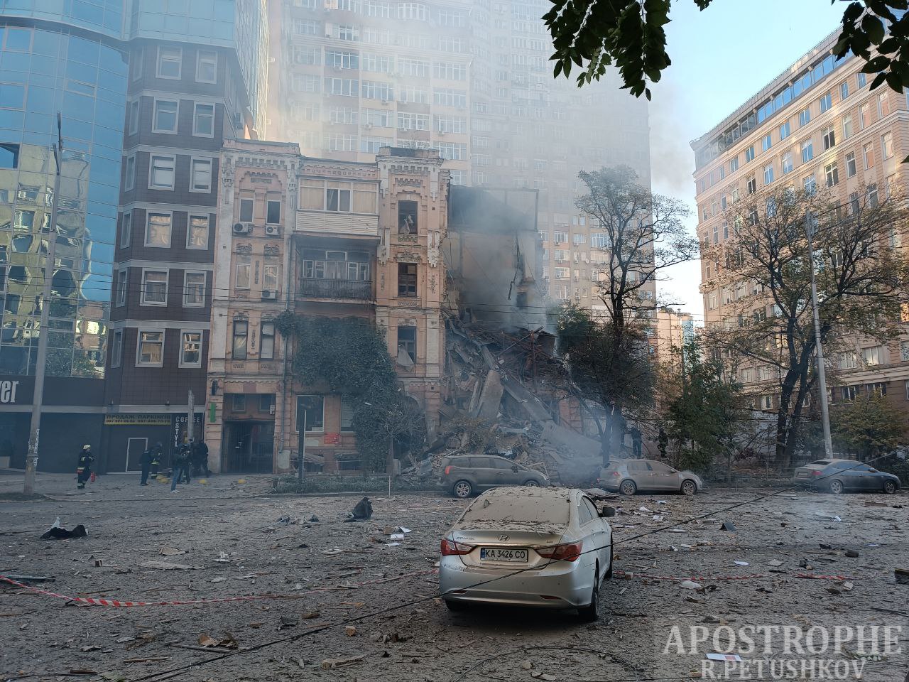 Утром в понедельник, 17 октября, российские оккупанты дронами-камикадзе обстреляли многоэтажку в Шевченковском районе Киева. Разбор завалов продолжается, там остаются люди.
