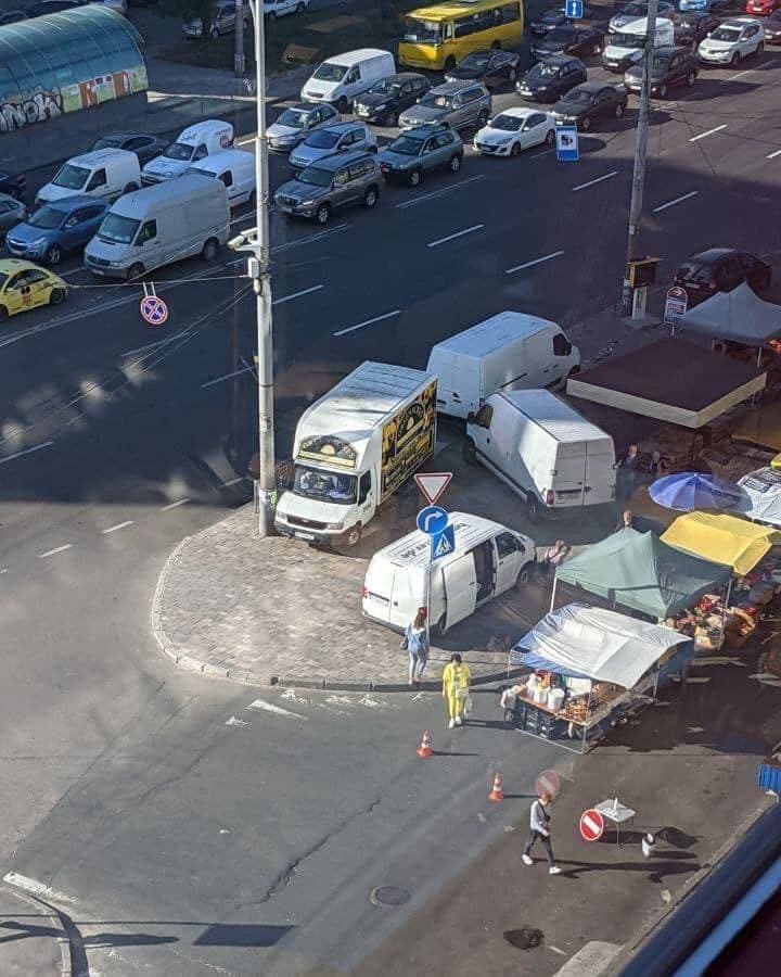 В Киеве на проспекте Соборности, 4, водители оставили несколько авто на тротуаре, превратив его в "паркинг", а недавно на Теремках у автомобиля "героя парковки" сняли колеса и оставили на капоте записку с "интересным предложением".