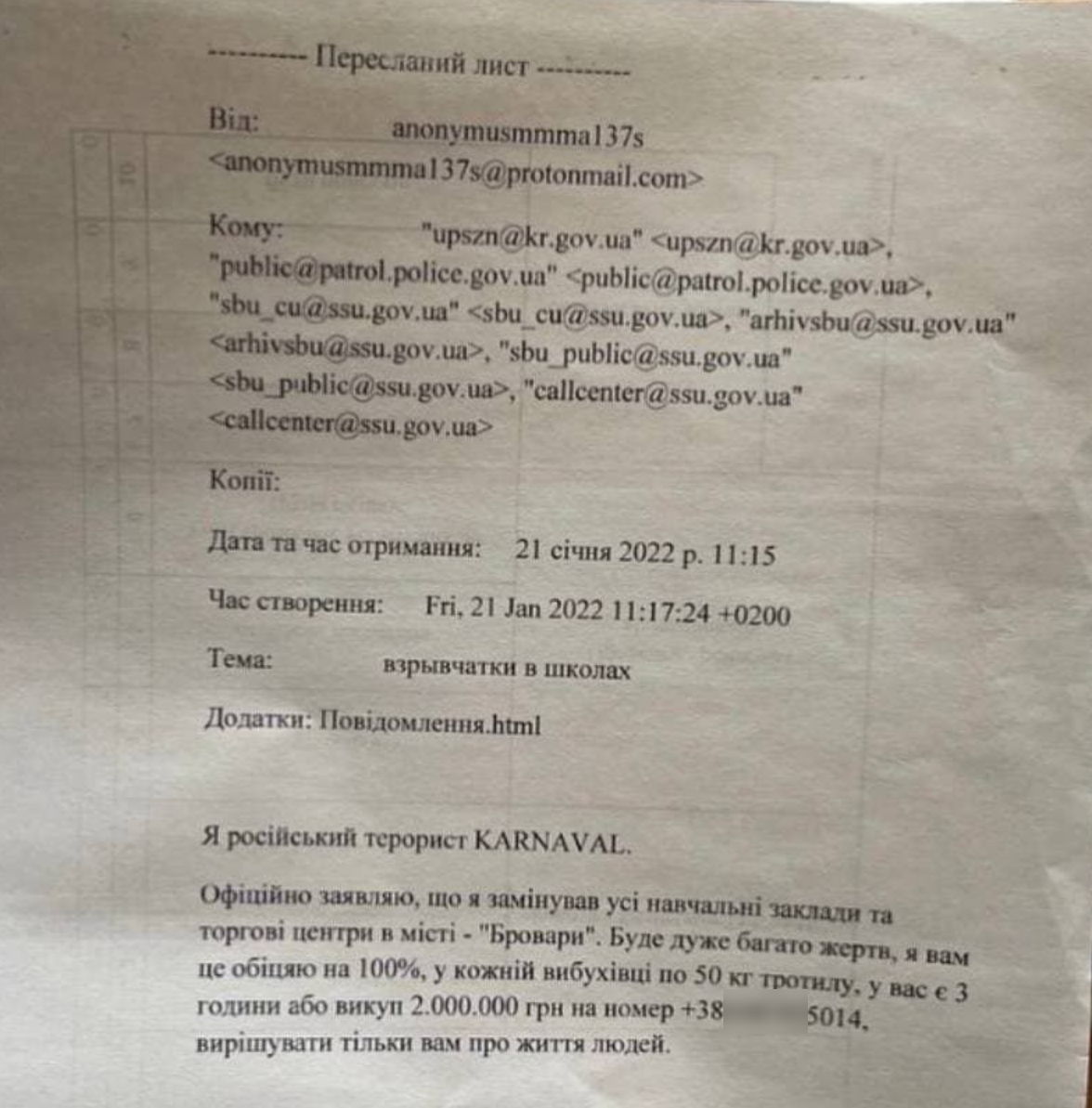 В пятницу, 21 января, в Сети появилось обращение неизвестного, который назвал себя российским террористом, и заявил, что заминировал все ТЦ и школы города Бровары под Киевом. "Террорист" требует кинуть ему выкуп в 2 млн грн по номеру телефона.