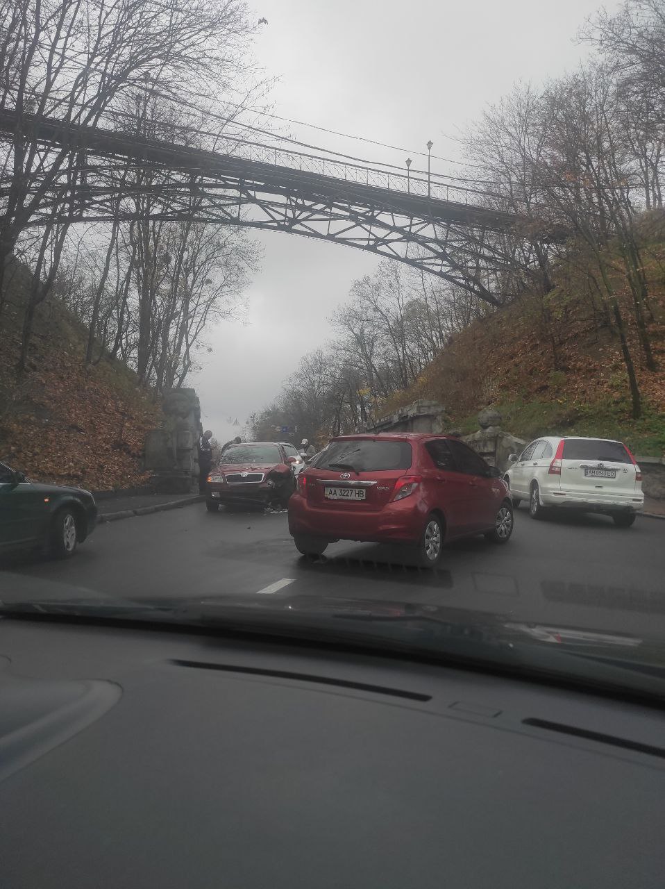 В Киеве на Парковой дороге в Печерском районе столицы произошло ДТП – ее виновник выехал на встречную полосу, тем самым повлек за собой пробку и аварию.