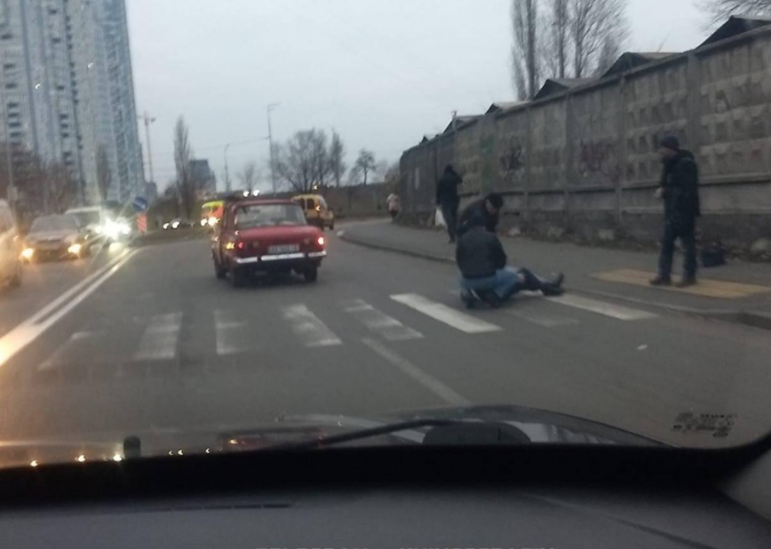 В четверг, 25 ноября, в Днепровской районе Киева водитель "Москвича" не пропустил женщину на пешеходном переходе. Пострадавшей оказывают помощь очевидцы.