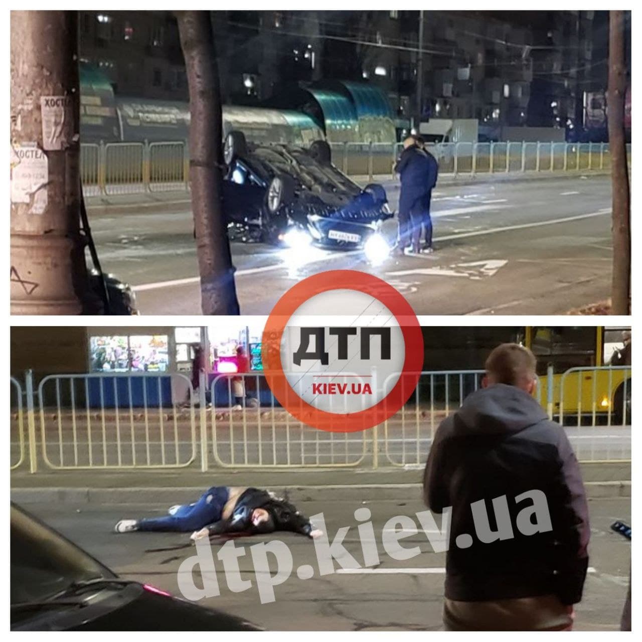 Авария с опрокидываением автомобиля случилась на бульваре Перова в Днепровском районе столицы. В результате ДТП легковой автомобиль перевернулся на крышу. Из автомобиля вылетел человек - он погиб.