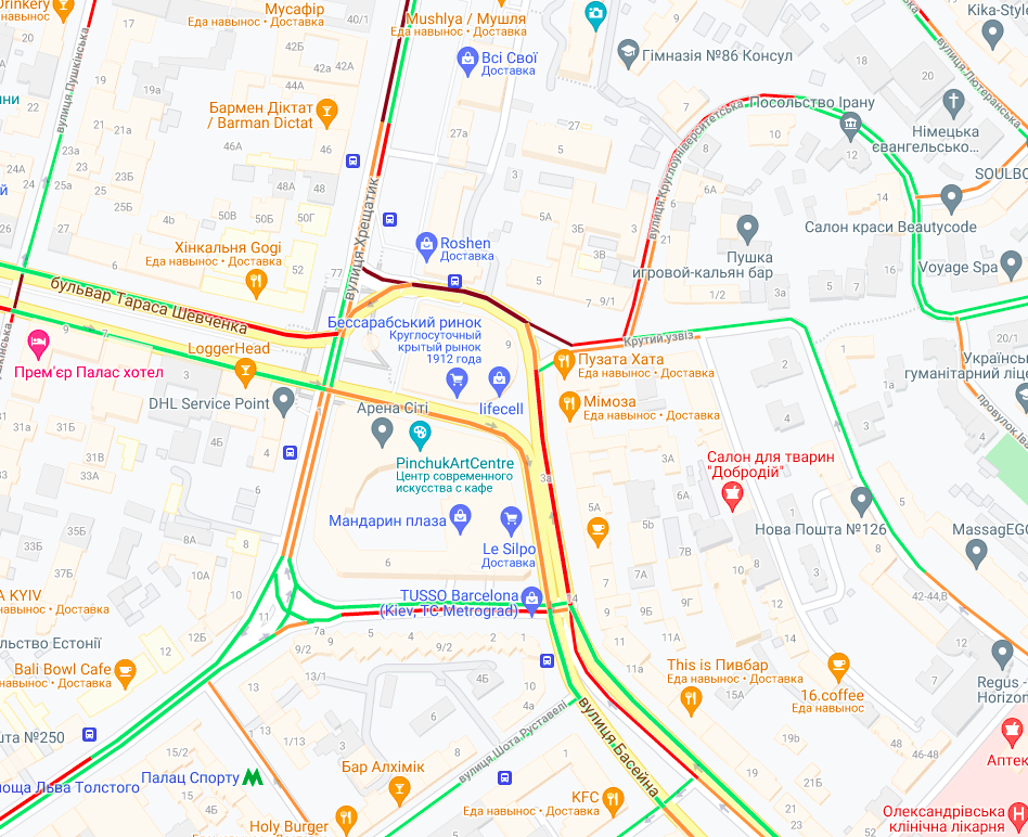 Как свидетельствуют данные сайта infoportal.kiev, трудно проехать возле Бессарабского рынка и по ул. Крещатик (в сторону Бессарабки).
