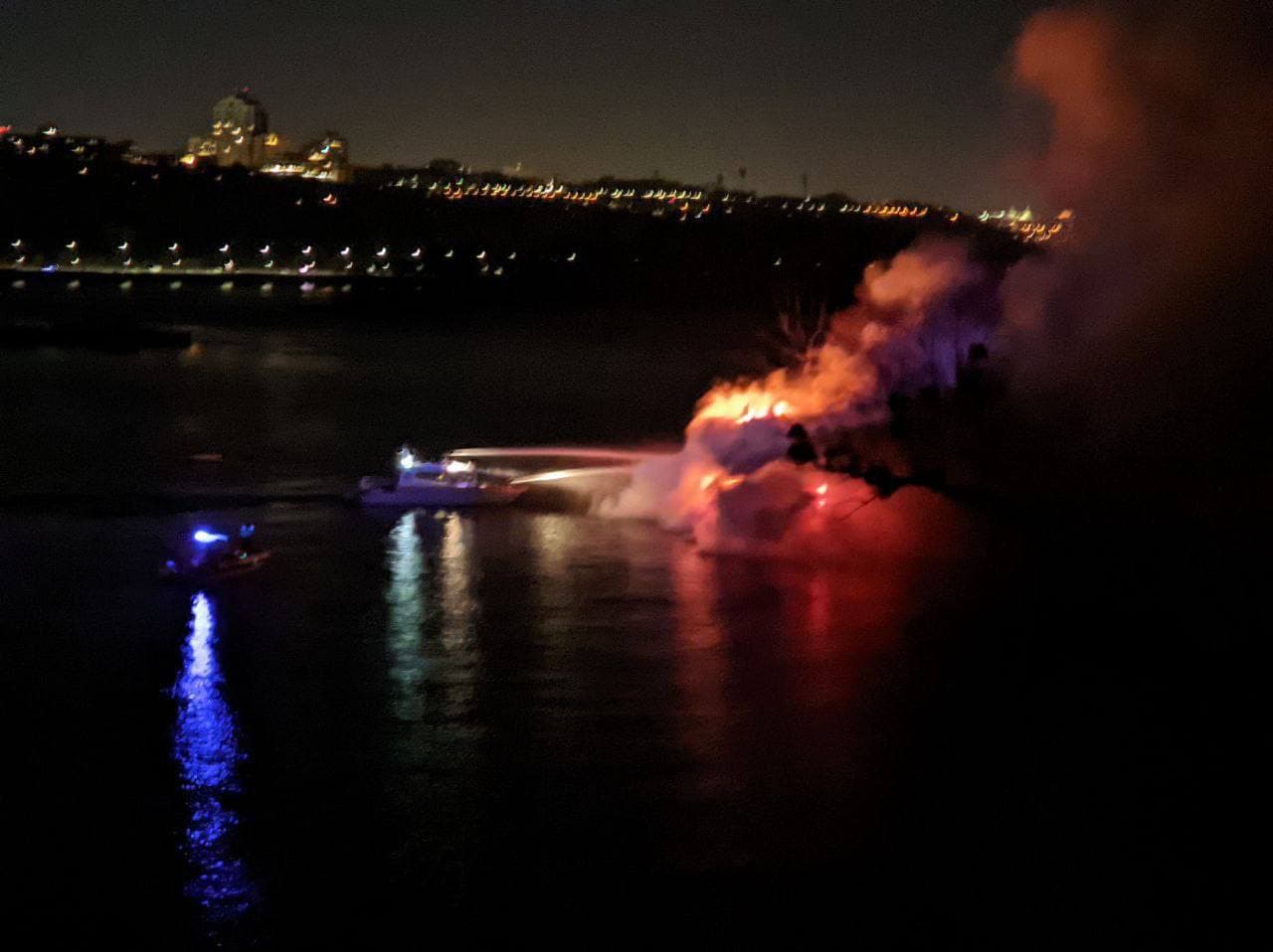 "В районе Гидропарка, в заливе р. Днепр (близ Венецианского моста), на однопалубном плавучем кафе возник пожар. В 21:16 он был локализован на площади 160 м кв. От ГСЧС привлечено 20 человек и 4 ед. техники", - пишут в ведомстве.