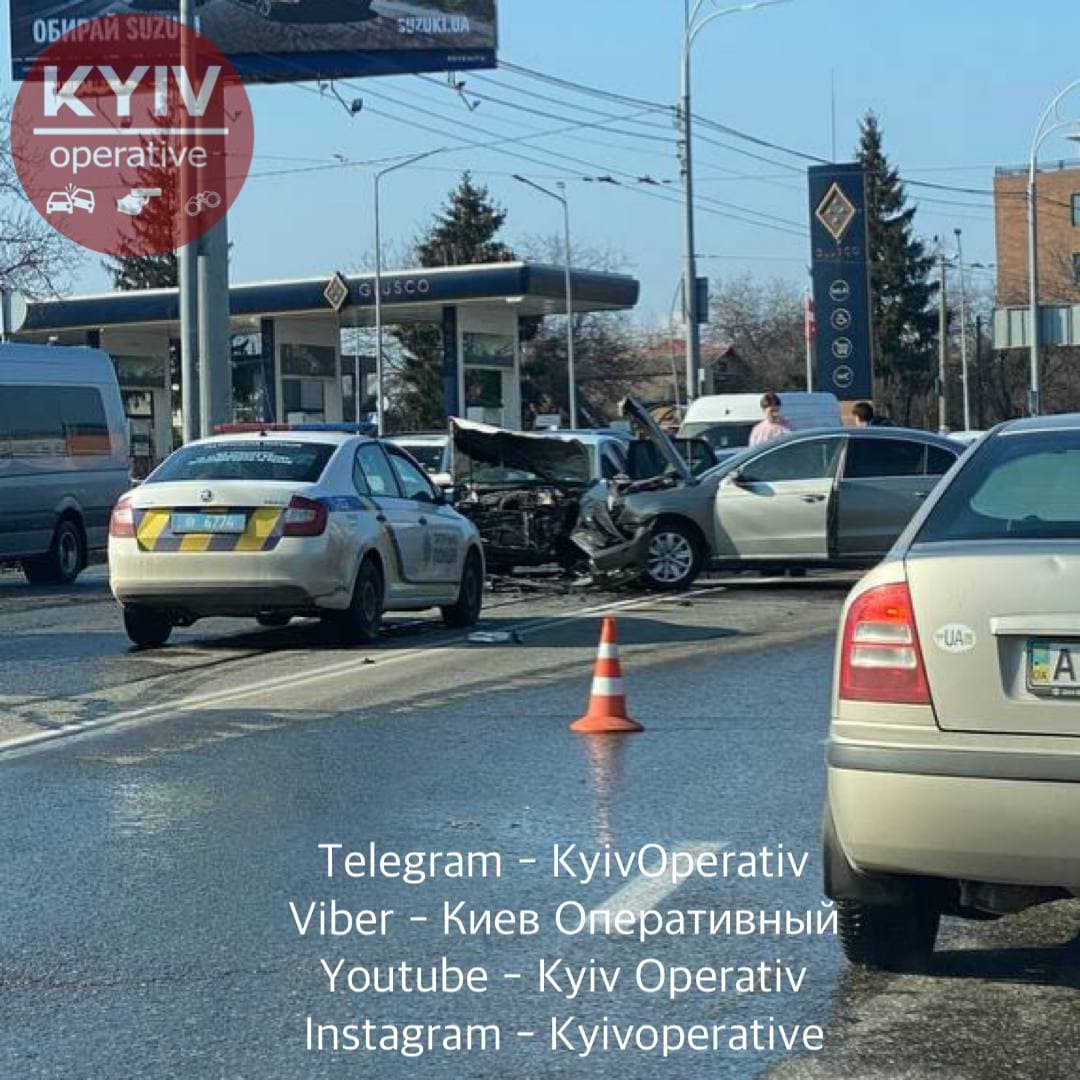 Столкновение произошло на проспекте Лобановского, 88, возле автозаправочной станции "Лукойл" около 15 часов 13 марта. Столкнулись два легковых автомобиля, которые получили значительные повреждения - их буквально "разворотило". В аварии пострадал еще один автомобиль.