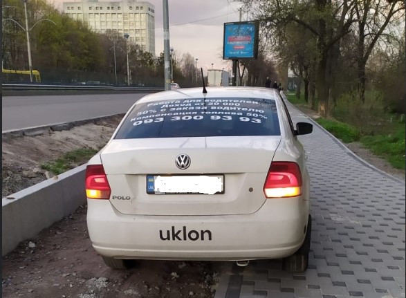 На фото можно увидеть авто Volkswagen, на котором написано Uklon. А значит водитель работает в популярной службе такси. Он припарковал авто на недостроенной велодорожке и тротуаре на улице Борщаговская. Разумеется, это вызвало гнем людей.
