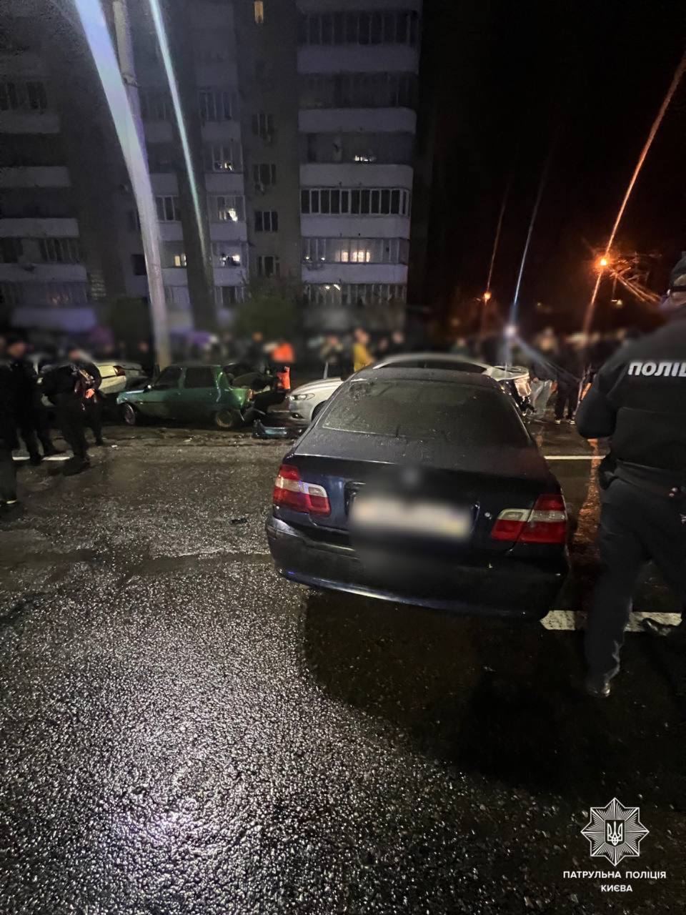 В субботу вечером, 11 ноября, на Караваевых дачах в Киеве водитель автомобиля BMW протаранил пять машин. Между виновником масштабного дорожно-транспортного происшествия и владельцами поврежденных авто произошла потасовка.
