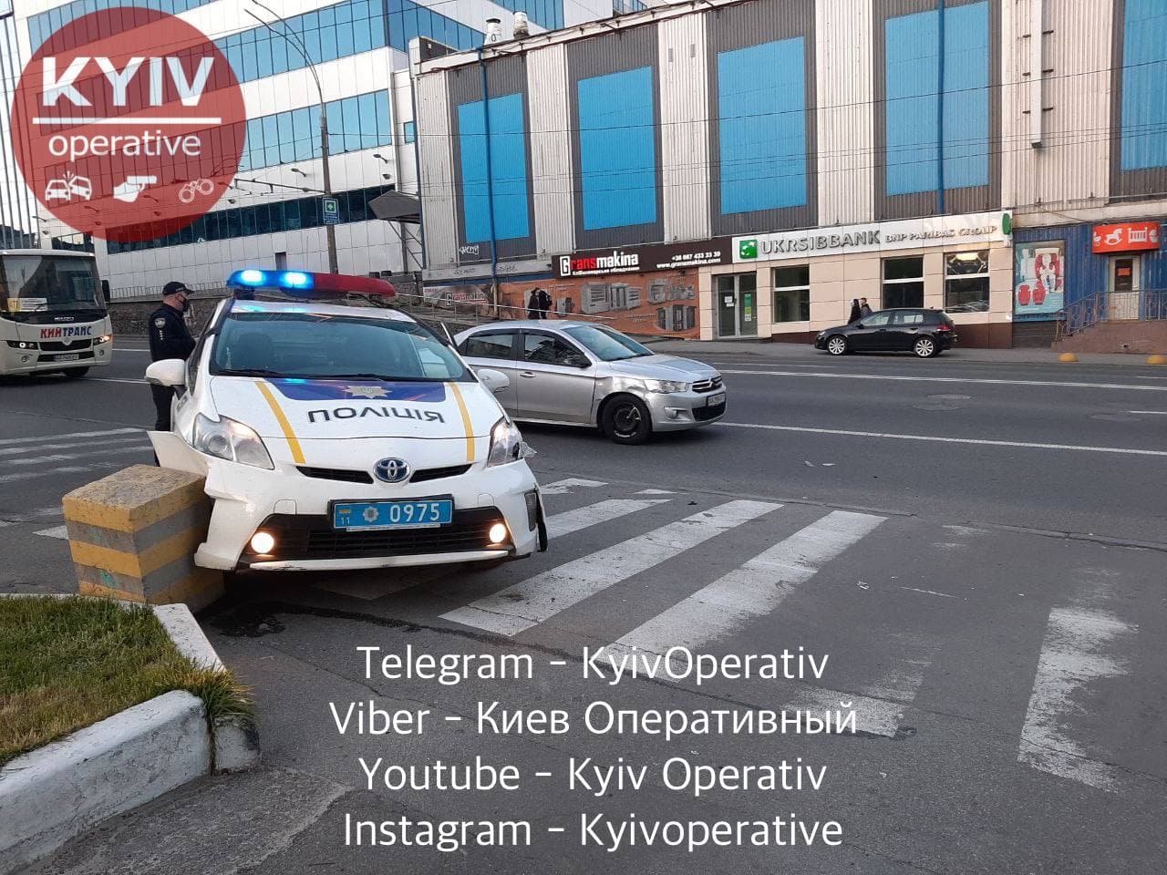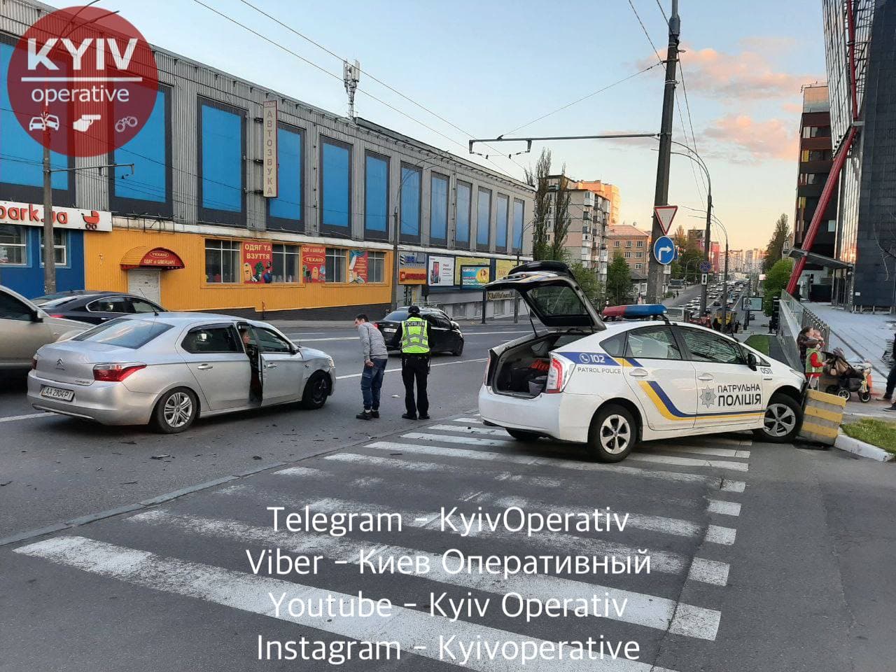 Вечером в воскресенье, 9 мая, на улице Вадима Гетьмана в Киеве водитель Citroen, заезжая на парковку торгово-развлекательного центра, столкнулся с автомобилем патрульной полиции Toyota Prius.