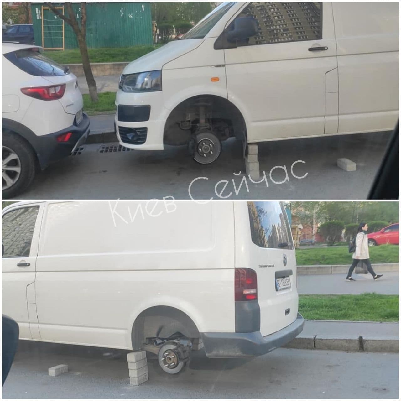 В Киеве произошло дерзкое ограбление просто на улице - воры сняли колеса с микроавтобуса, оставленного на тротуаре.
