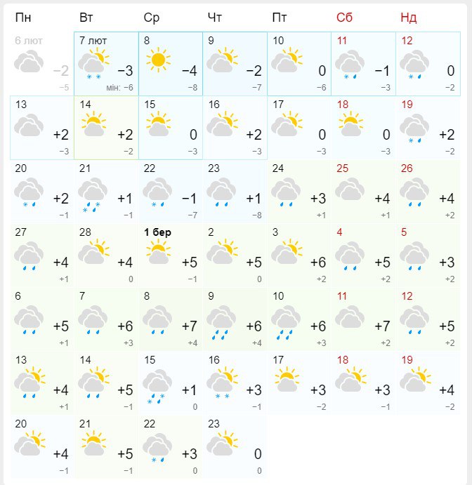 В то же время, уже с 13 февраля погода несколько улучшится: незначительные морозы будут спускаться на столице только ночью, а днем воздух будет прогреваться до +2 градусов. Временами ожидается осадки в виде мокрого снега с дождем. Однако достаточно морозные ночи с -7-8 градусов прогнозируются 22 и 23 февраля.