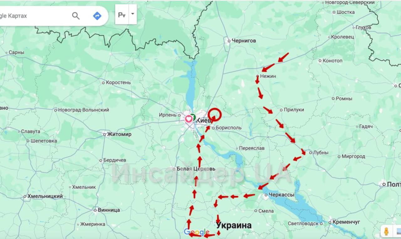 В сети показали приблизительную траекторию подлета к столице российской ракеты во время второй атаки.