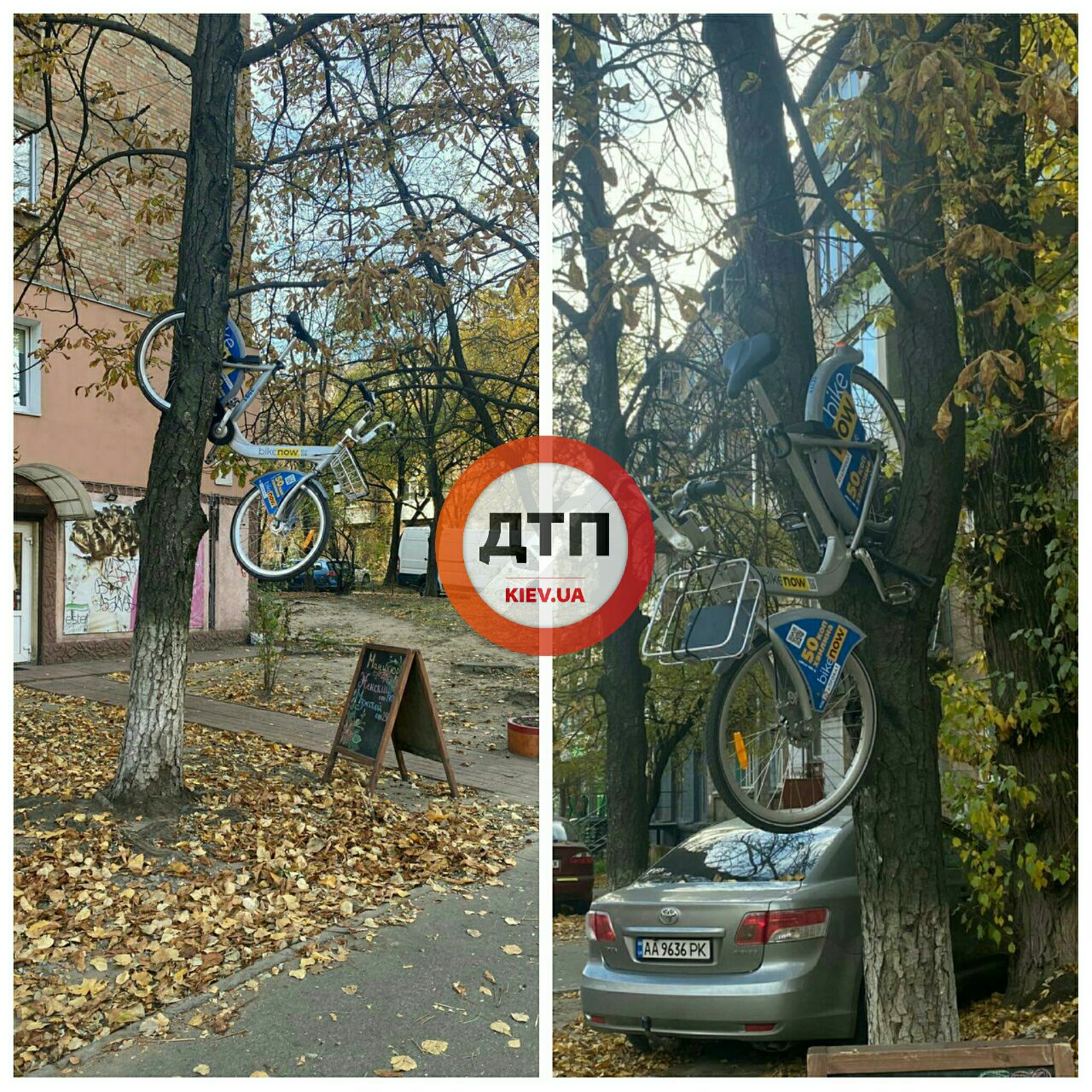 В Шевченковском районе Киева неизвестные забросили прокатный велосипед на дерево.