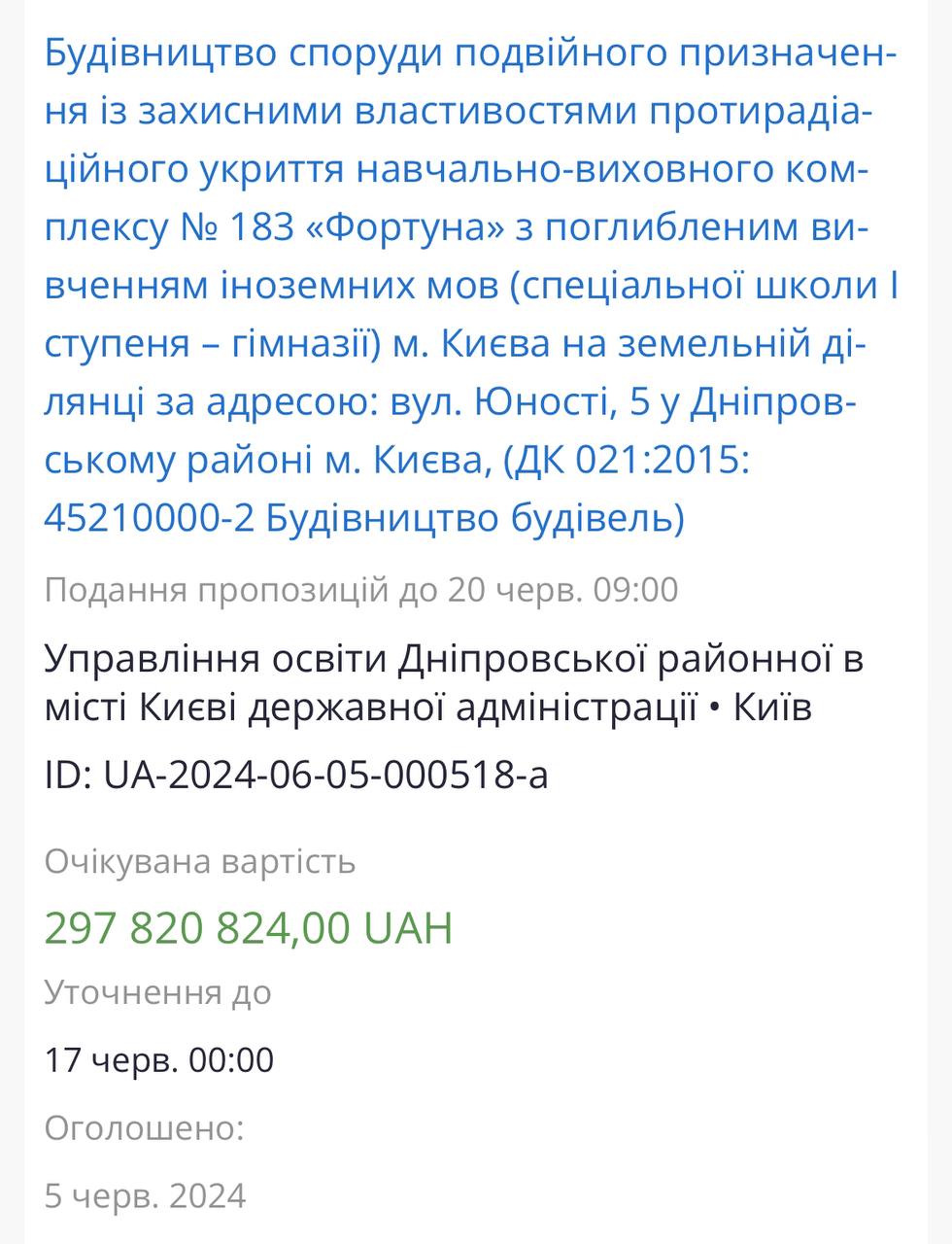 Укрытие за 298 миллионов гривен планируют построить на территории гимназии №183 "Фортуна" до конца 2025 года. Данная гимназия расположена в Днепровском районе столицы, на улице Юности, 5.