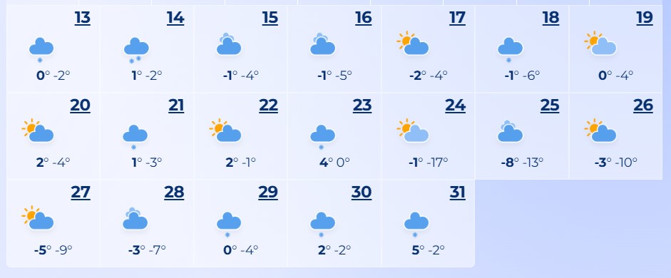 В понедельник и вторник, 13-14 января, в столице ожидаются снегопады. Температура днем на следующей неделе будет от -2 мороза до +1 градуса тепла. Также снегопады ожидаются 21, 23, 29-31 января.