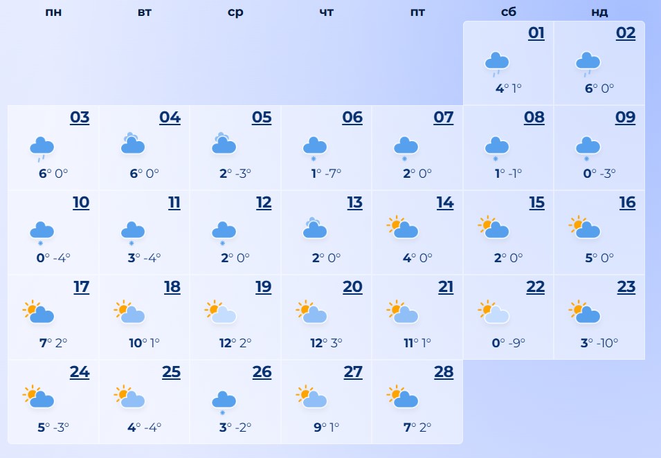 В течение месяца температура днем будет 0...+12 градусов, ночью – от 10 градусов мороза до +3. Снегопады прогнозируются 6-12 и 26 февраля.
