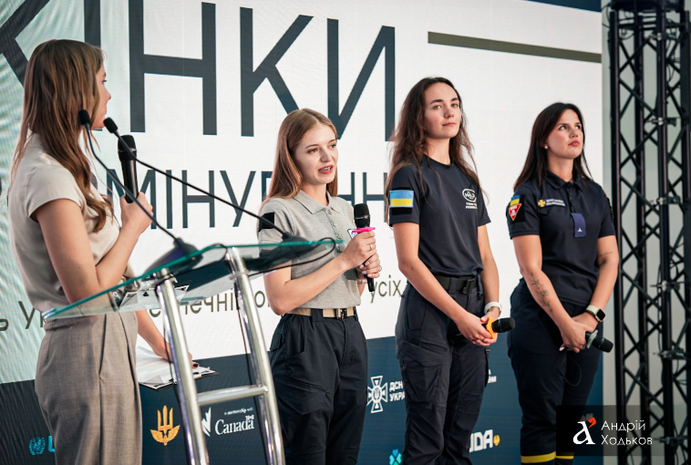 В дискуссии приняли участие во время открытия мероприятия – героини фотопроекта: Диана Обжелян, Анна Сергиенко, Валерия Осыка. Их судьбы изменило полномасштабное вторжение, из-за чего приобщились к разминированию самых загрязненных взрывоопасными предметами регионов страны.