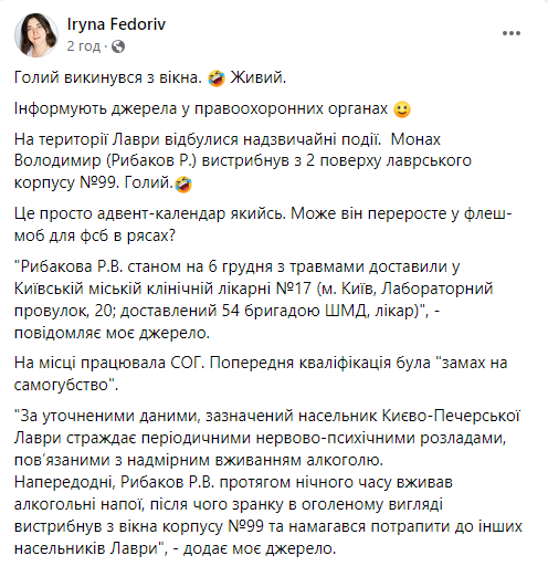 В среду, 6 декабря, со второго этажа корпуса №99 Киево-Печерской Лавры выпрыгнул монах Владимир (Рыбаков Р.). Причем монах был без одежды.