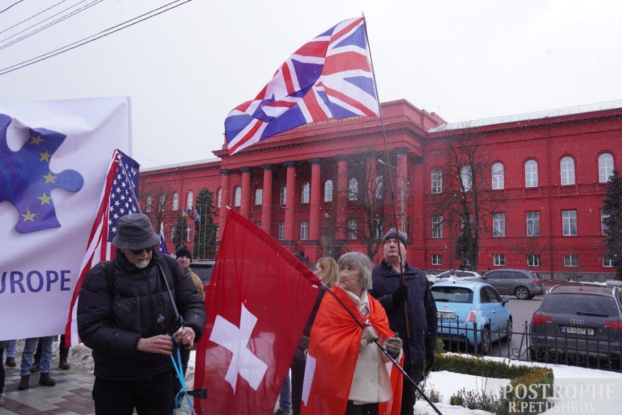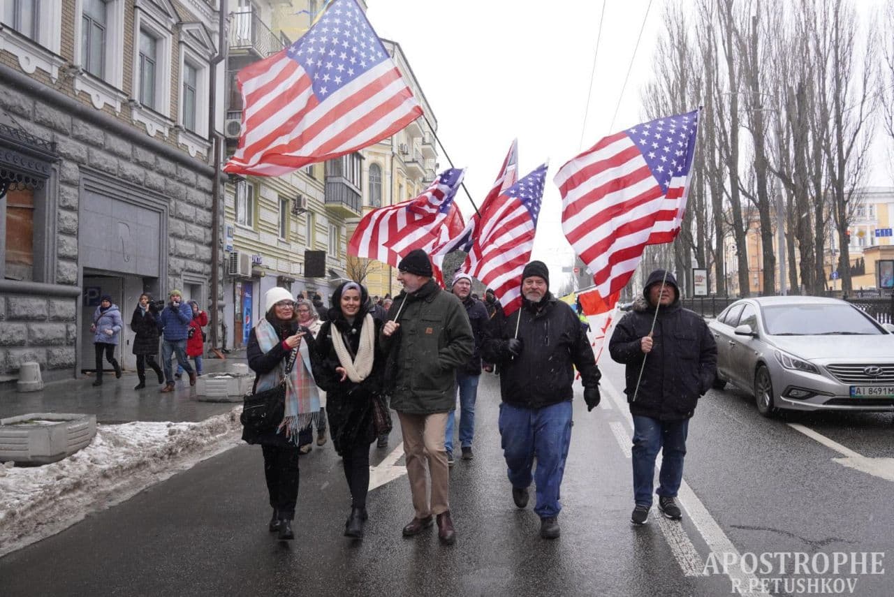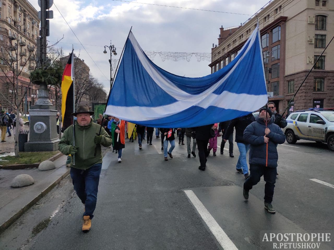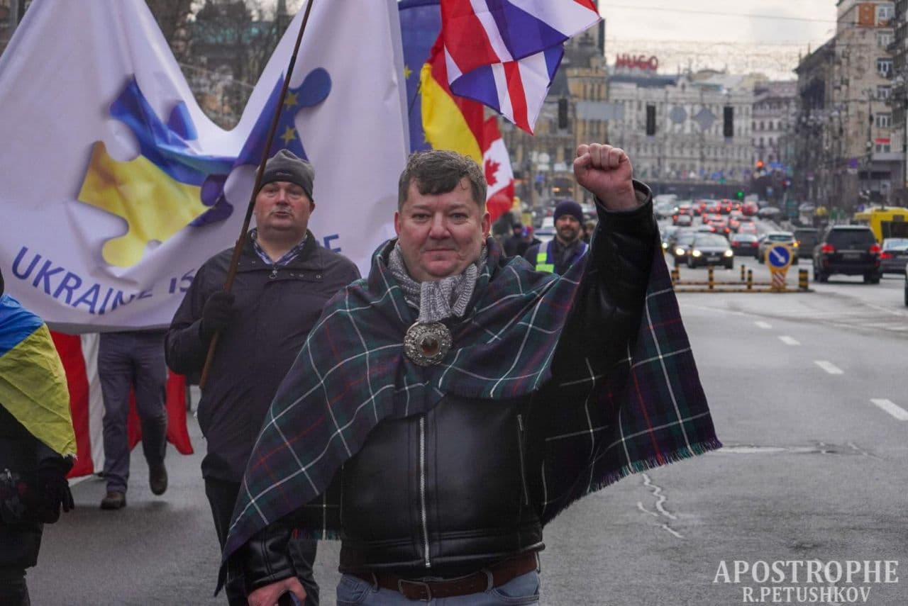 В воскресенье, 6 февраля, в Киеве прошел "Марш единения" против угрозы российского полномасштабного вторжения, которое возглавил эмигрант, бизнесмен Стюарт Маккензи.