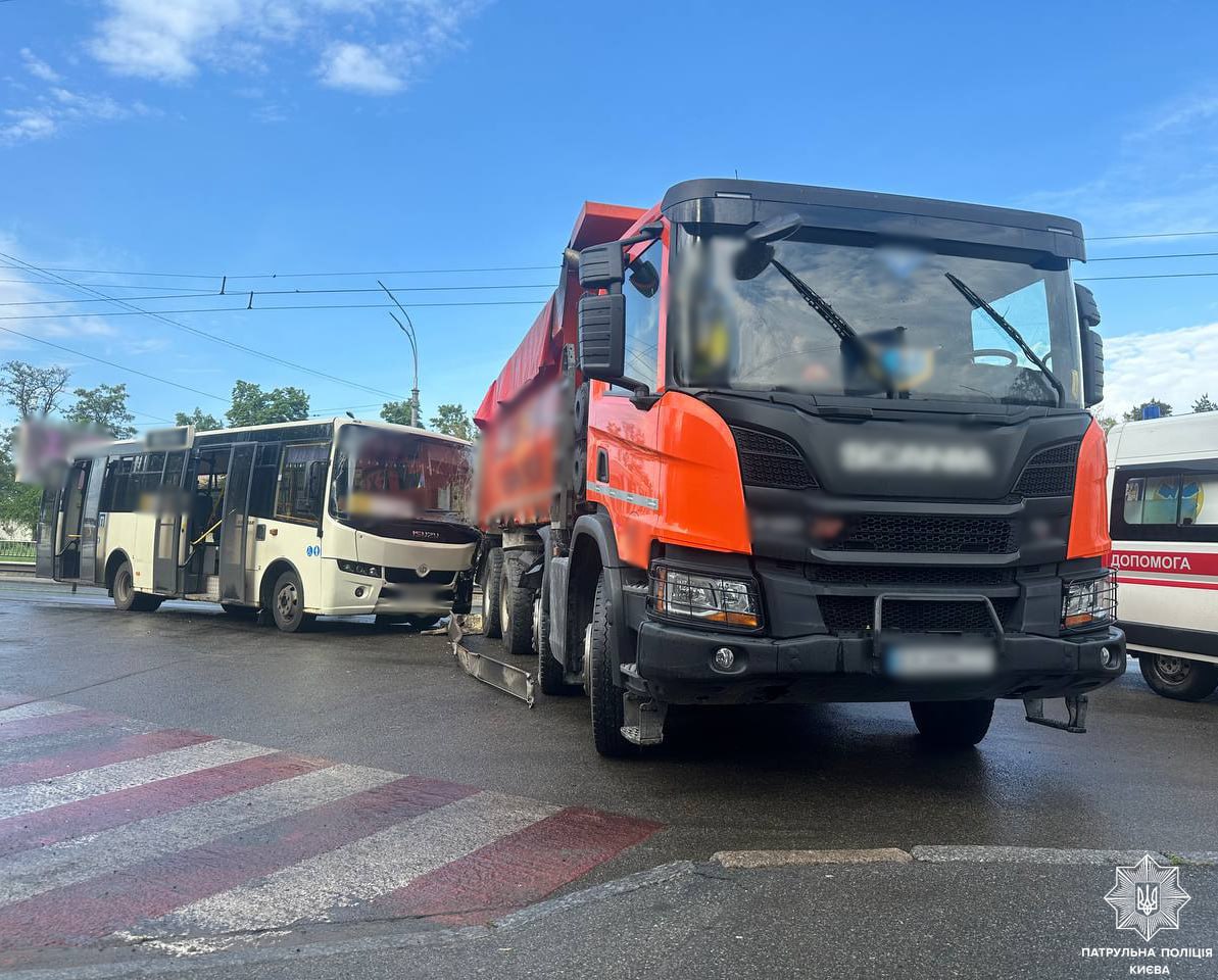 В сообщении говорится, что дорожно-транспортное происшествие произошло около 8:00 в Днепровском районе столицы. Предварительно известно, что водитель грузового транспортного средства, двигаясь по проспекту Георгия Нарбута, выполнял маневр поворота со второй полосы - в результате этого и произошло столкновение с маршрутным такси.