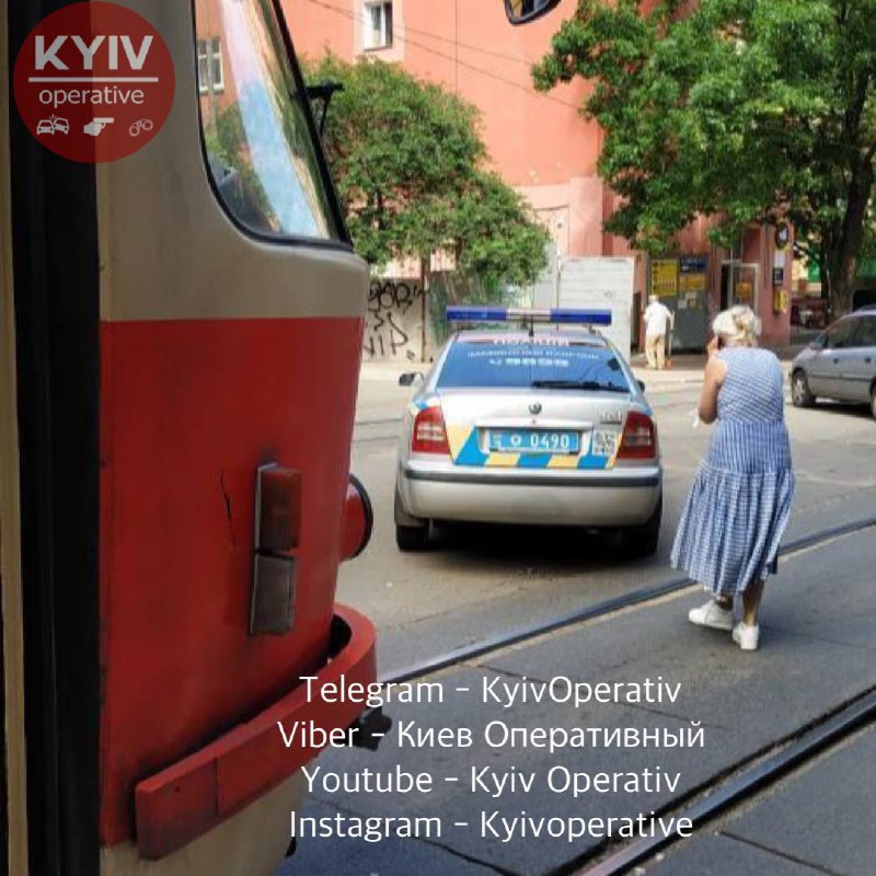 В Шевченковском районе Киева на фото попал автомобиль полиции, который перекрыл проезд трамваям.