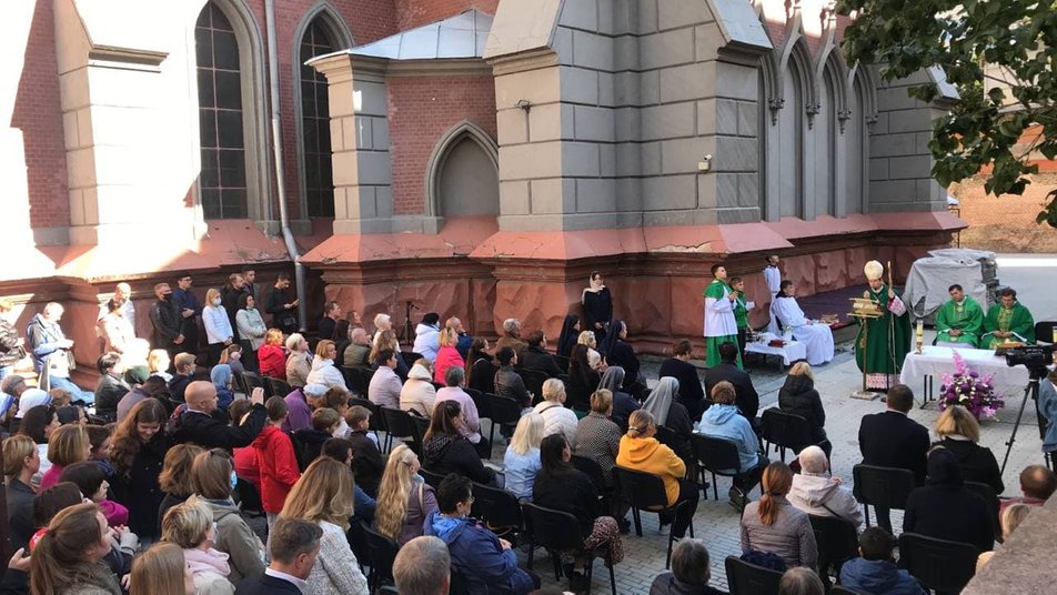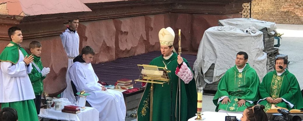 В Киеве, в 10:00 5 сентября, провели мессу у входа в костел Святого Николая, который сильно пострадал от недавнего пожара.