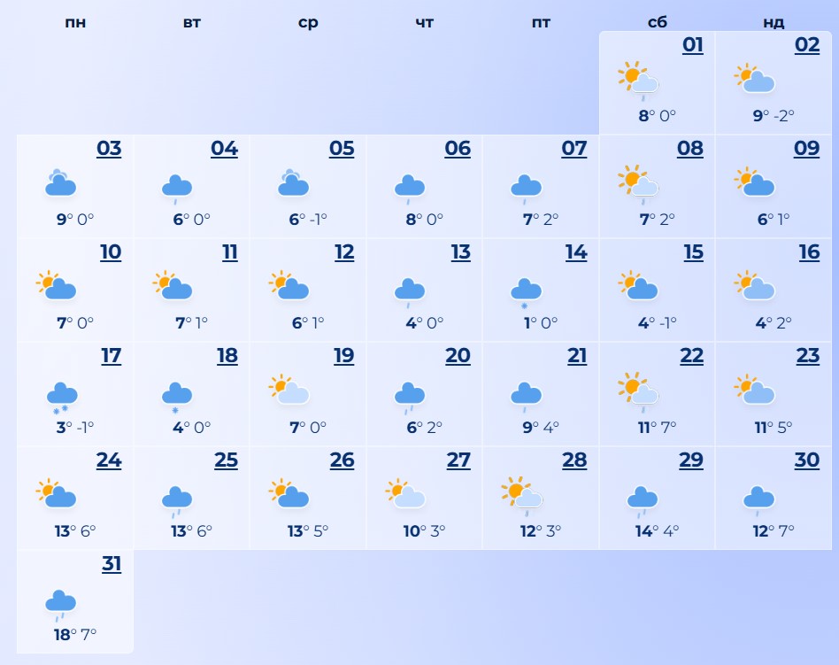 Дожди в первый день весны будут идти 14 дней – 1, 4, 6-8, 13, 20-22, 25 и 28-31 марта.