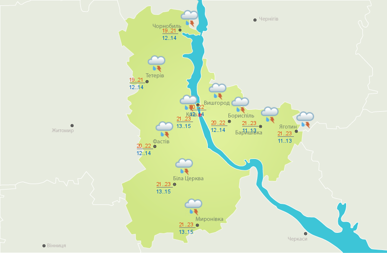 Температура воздуха в регионе будет колебаться в пределах 11-15 градусов тепла ночью, днем – 19-23°. Ночью - без осадков, а в светлое время суток ожидаются в Киеве и области ливни.