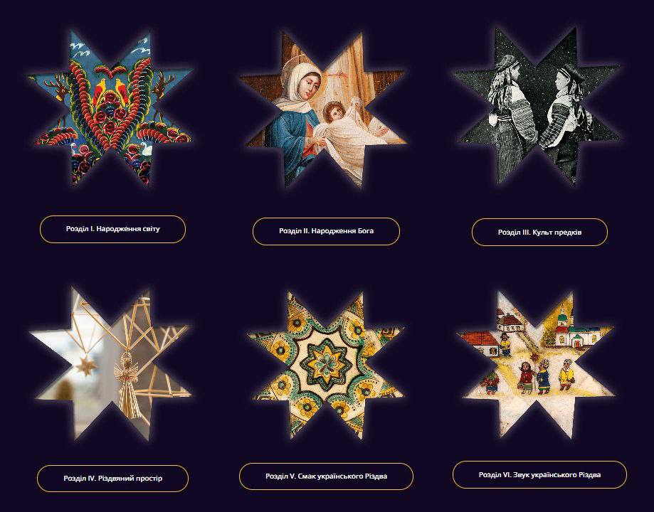 Проект содержит семь разделов, охватывающие разные страницы истории о настоящем украинском Рождестве. Также у выставки есть английская версия.