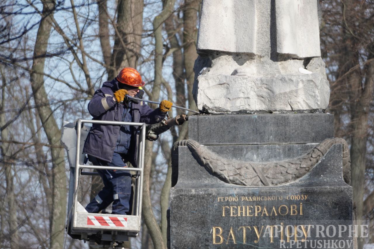 Сегодня, 9 февраля, в Киеве провели демонтаж памятника советскому генералу Ватутину, как это на днях сделали и с памятником советского пилота Чкалова в рамках дерусификации столицы.
