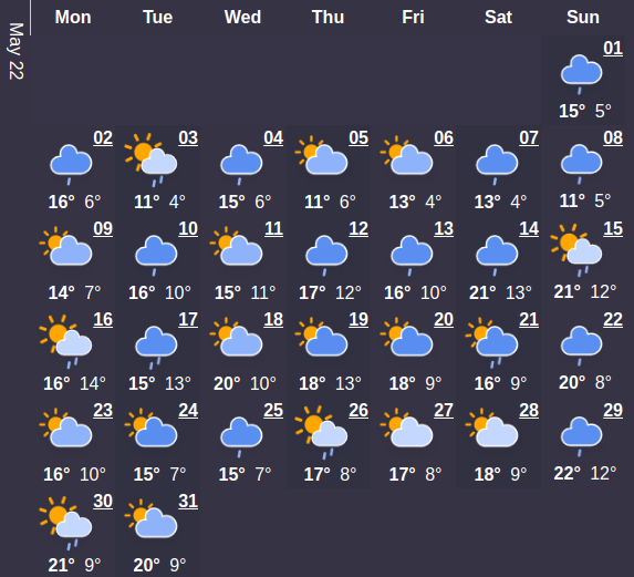 Май в Киеве будет не такой теплый, как прогнозируют в целом по Украине. Средняя температура будет +13 градусов тепла. Холоднее всего будет 3 мая - 4 градуса тепла. А 29 мая день будет самый теплый - ожидается +22. Прогнозируются умеренные осадки с 17 по 22-е число.