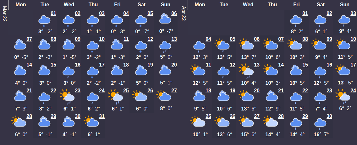 До 3 апреля температура воздуха будет колебаться от +1 до +8 градусов. В начале апреля будет тепло, но влажно. Периодами температура воздуха будет достигать 16 градусов тепла. В середине месяца прогнозируют небольшие осадки, хотя большинство из них выпадет приблизительно 5 апреля.