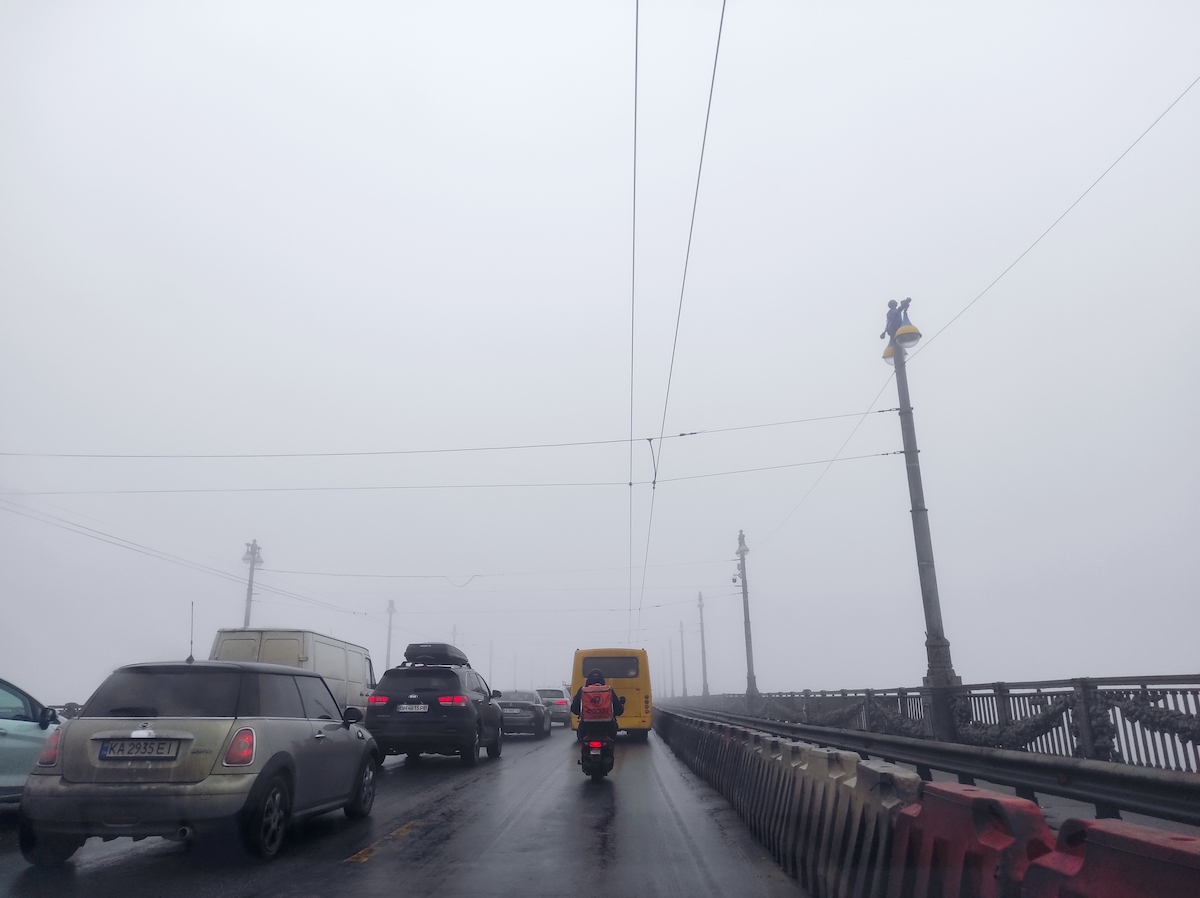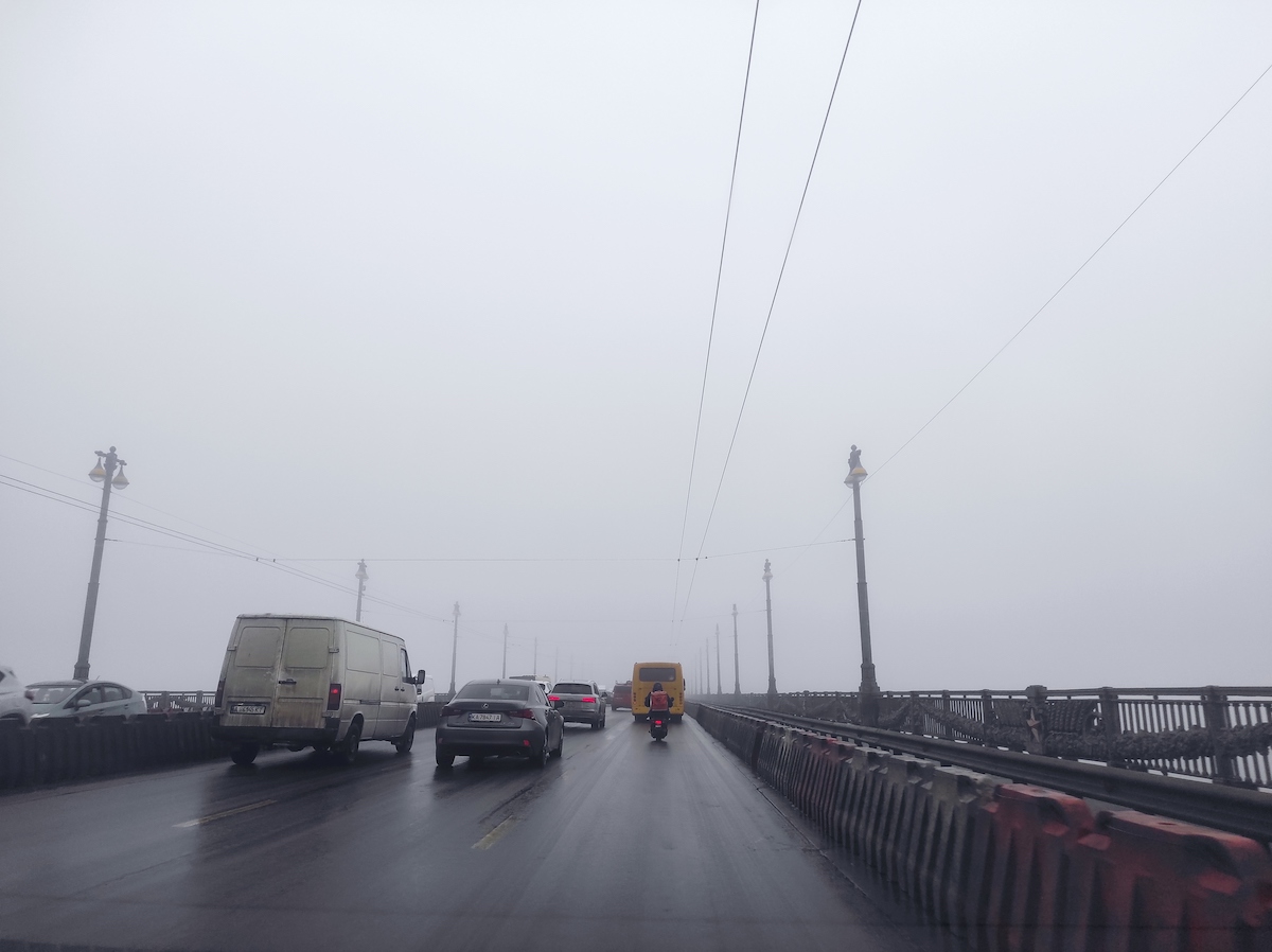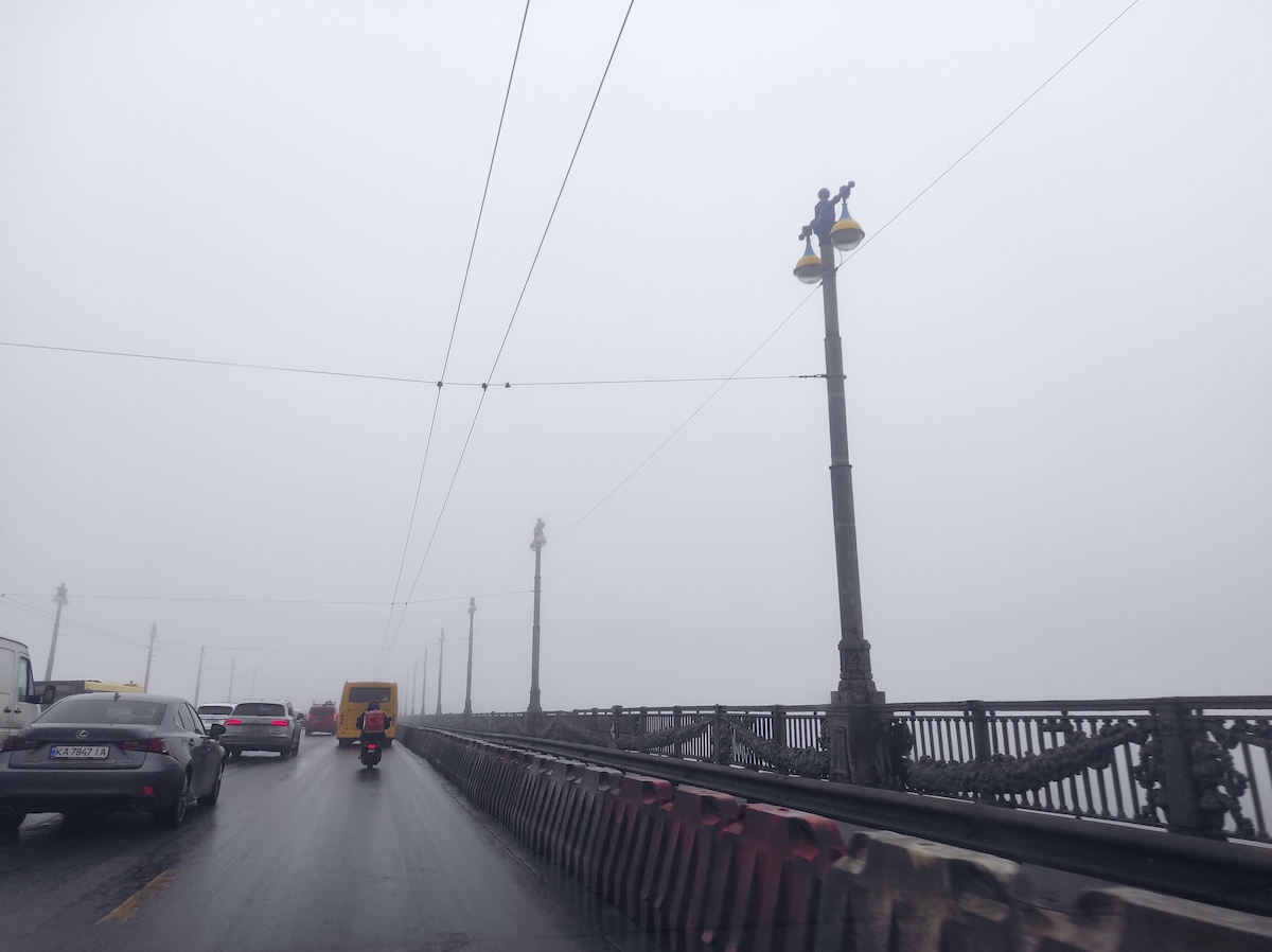 По словам синоптиков, видимость в Киеве сейчас на уровне 200-500 метров. Читатели "Апострофа" прислали фотографии, подтверждающие туманную погоду. Например, если ехать по мосту Патона на правый берег столицы, то даже Родину-Мать высотой 62 метра совсем не видно.