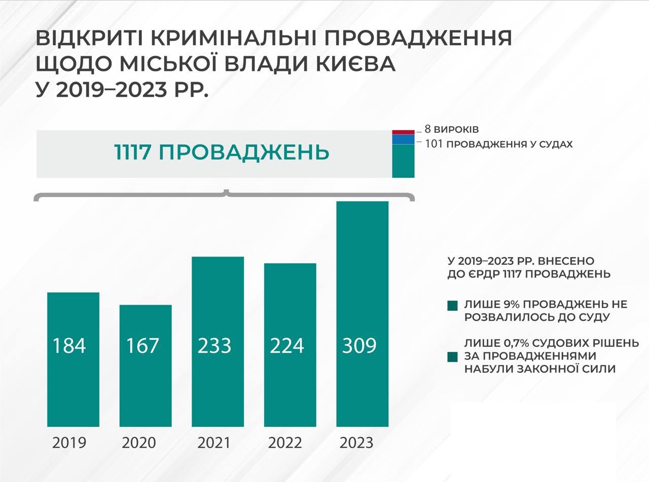 Статистика свидетельствует о том, что с каждым годом количество уголовных производств против киевской громады растет. Небольшой спад, в рамках статистической погрешности, наблюдался только во время ковида и в начале войны.