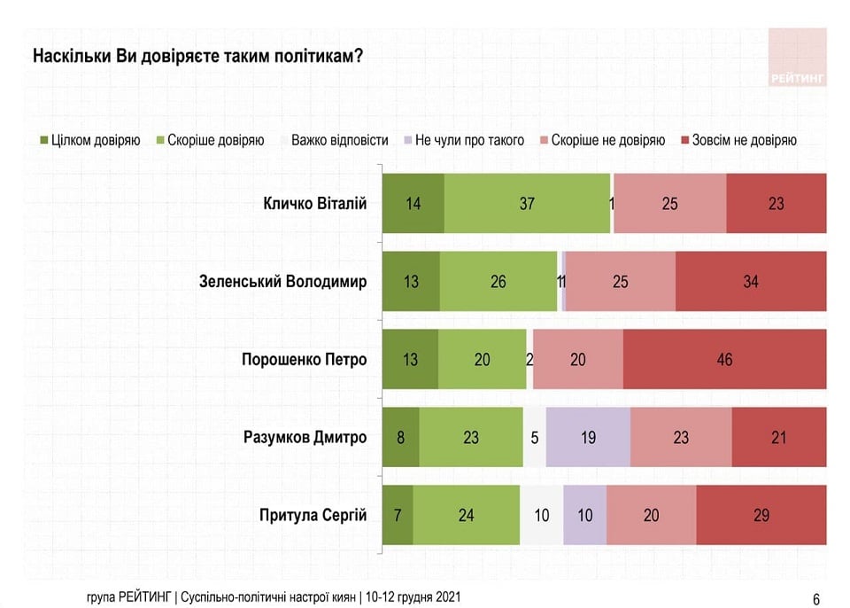Лидер политической партии "УДАР", мэр Киева Виталий Кличко имеет самый высокий уровень поддержки у киевлян среди украинских политиков. Ему доверяют более 50% жителей столицы. В то же время уровень доверия к президенту Владимиру Зеленскому составляет 39%. Он на второй позиции рейтинга доверия.
