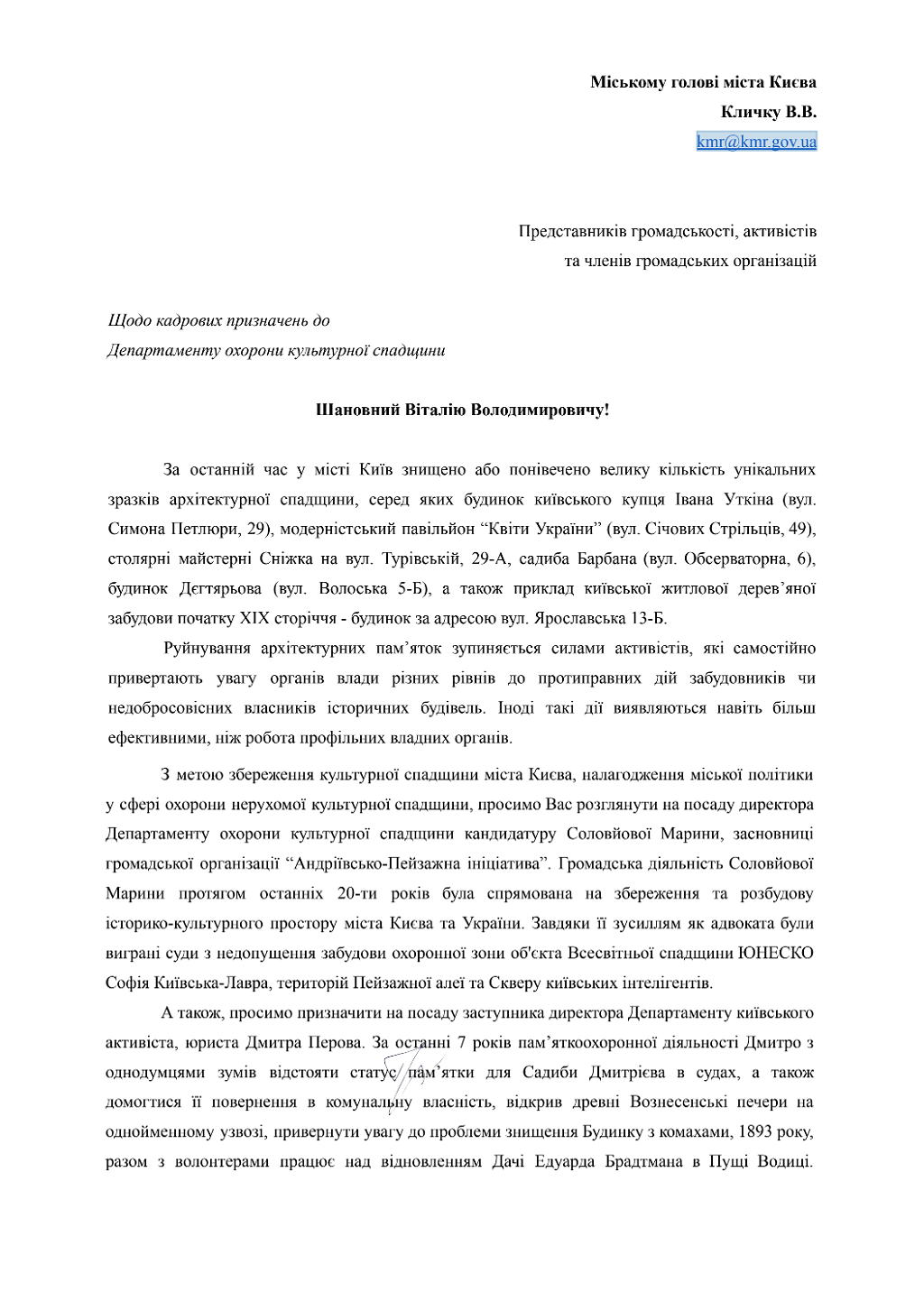 Ранее мэр Киева Виталий Кличко сообщил, что Департамент охраны культурного наследия КГГА возглавит Марина Соловьева, которая "всегда заботилась о сохранении старого Киева и многое для этого сделала". А ее заместителем станет активист Дмитрий Перов, кандидатуру которого, по словам мэра, предложила столичная общественность.