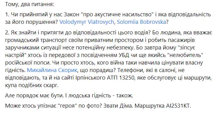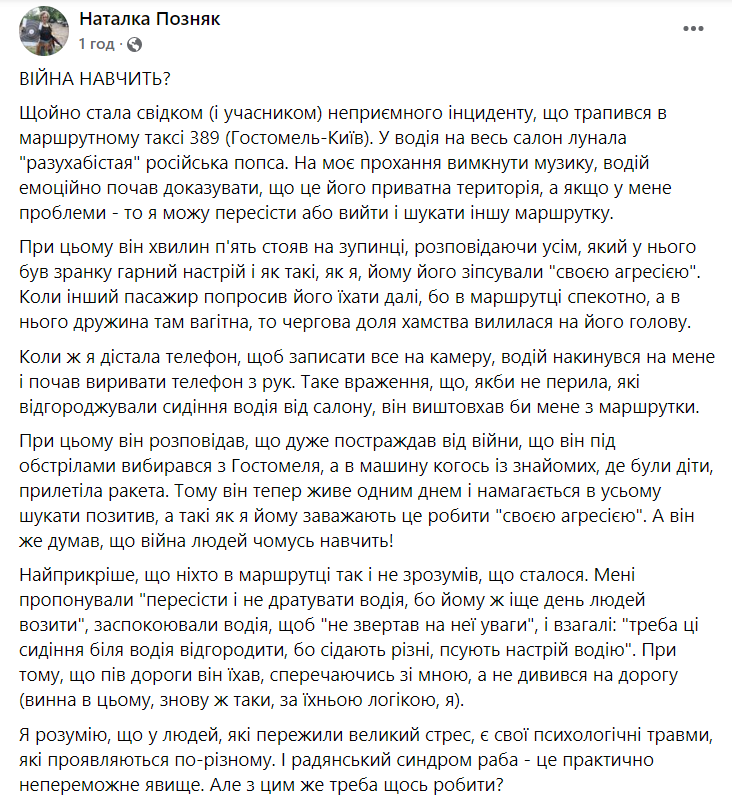 "Только что стала свидетелем (и участником) неприятного инцидента, случившегося в маршрутном такси 389 (Гостомель-Киев). У водителя на весь салон раздавалась "разухабистая" русская попса. По моей просьбе выключить музыку, водитель эмоционально начал доказывать, что это его частная территория, а если у меня проблемы – то я могу пересесть или выйти и искать другую маршрутку.