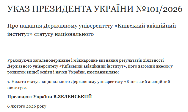 6 февраля президент Владимир Зеленский присвоил статус национального Государственного университета "Киевский авиационный институт".