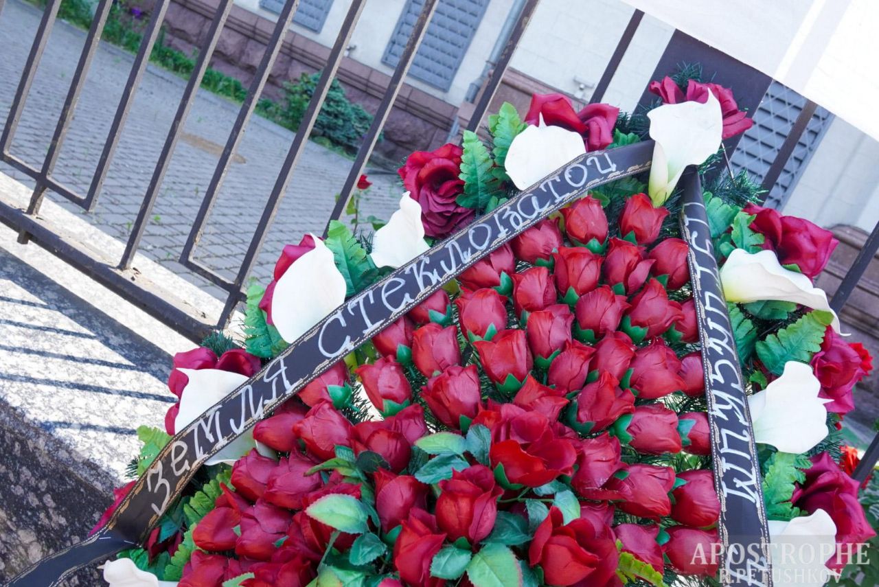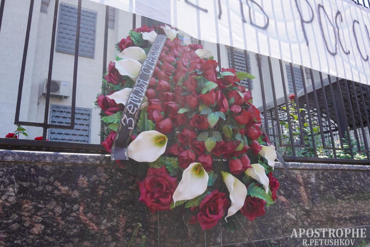 Активисты принесли под пустое посольство Российской Федерации похоронный венок с надписью "земля стекловатой" и русские патроны и гильзы из-под Киева. Участники акции вывесили плакат "Последний День России" и заявили, что в следующем году страны-агрессора уже не будет существовать.
