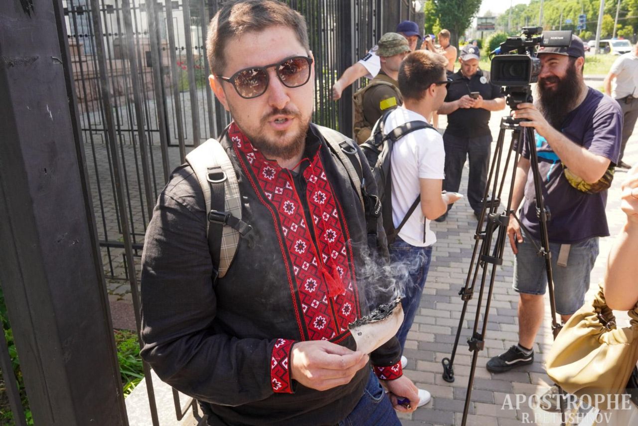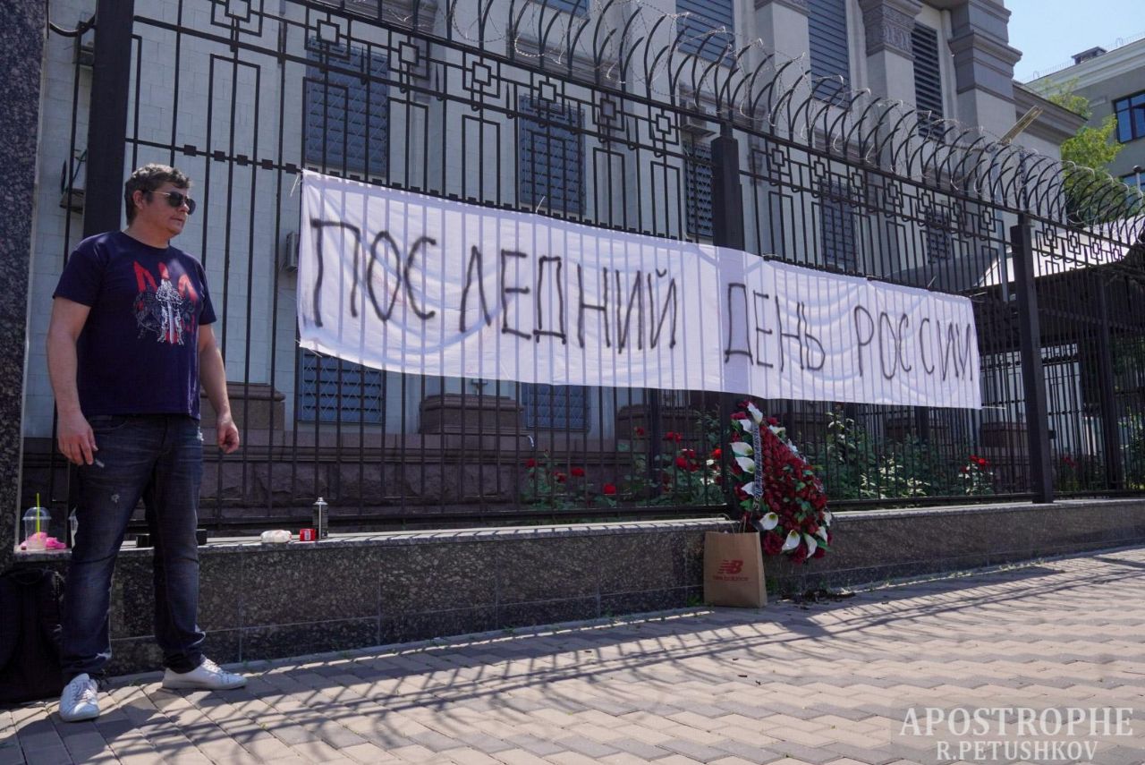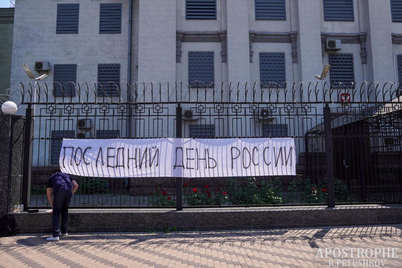 В воскресенье, 12 июня, в Киеве возле здания бывшего российского посольства на Воздухофлотском проспекте, 27, состоялась акция "Последний день России". Акция приурочена к дате, которую в государстве-агрессоре отмечают как День России.