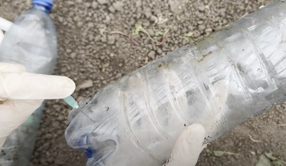 - Воткните в каждую бутылку иглу от шприца на расстоянии 2-3 см от дна бутылки. Это позволит воде медленно вытекать, создавая капельный полив растения.